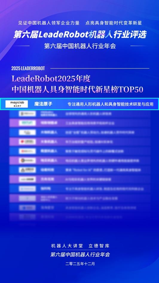 12月18日,第六届LeadeRobot我国机器人职业年会正式揭晓年度奖项,魔法原子凭仗抢先的技能优势与厚实的产品迭代,当选“LeadeRobot 2025年度我国机器人具身智能年代新星榜TOP50”,其高动态双足人形机器人MagicBot Z1荣获“LeadeRobot 2025年度人形机器人功能杰出奖”,充沛显示公司在具身智能范畴的立异实力与工业化潜力。此次获“年度人形机...更多